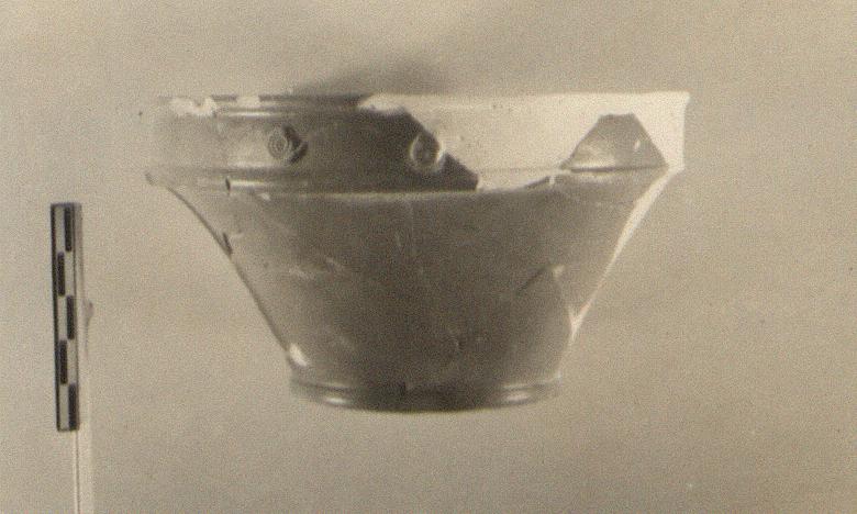 | Description: | Most of the floor, part of the wall, and about three-quarters of the rim restored in plaster. Ring foot, slightly concave side wall, and straight keeled rim with a double spiral in relief. Western Sigillata. | |