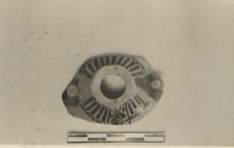 | Description: | The shoulder and ends of handles of a miniature Panathenaic amphora. Tongue pattern on shoulder, front and back; on the front, the helmeted head of Athena, left, and her right arm behind, hurling the spear. White for the arm, with a glaze outline. Coarse incision on the helmet. | |