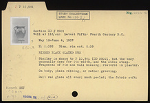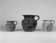 | Description: | Similar in shape to P 10980 (ΠΘ 2900), but the body unusually deep for its width, and the sides steep. Fragments of rim and wall missing; restored in plaster. On body, plain ribbing, or rather, grooves. Dull red glaze over all, much peeled; the fabric soft. Cf. Agora XII, no. 214. | |