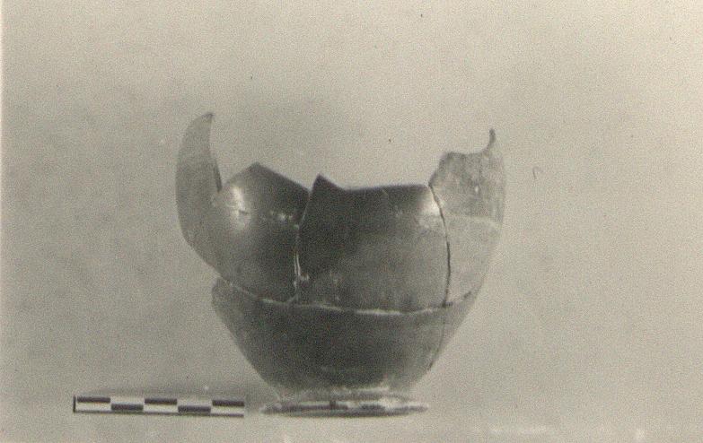| Description: | Thin-walled type. Most of body and rim, with both handles missing. Shallow widely flaring ring foot, and eggy body, drawn in at lip. Black glaze over all. | |