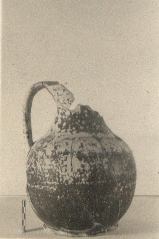 | Description: | Most of the trefoil mouth broken away and fragments missing from the walls. Restored in plaster. Slightly flaring ring foot and rather squat body with moderately tall neck. Pinkish-buff clay with dull black glaze, much pitted and peeled. Cf. Agora XII, no. 118. | |