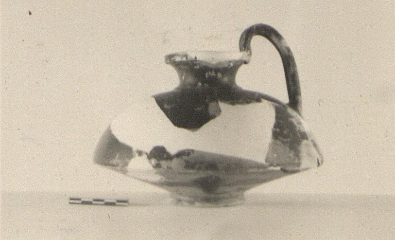 | Description: | One handle and much of upper body, and parts of lip and lower body missing. Restored in plaster. Ring foot and shallow lower body meeting the convex upper body at a sharp angle; short narrow neck with a moulded ring below and a round mouth. Double rolled rising handles, lip to shoulder, set about at right angles to each other; one is missing. Streaky red glaze inside; dull black on upper body outside, and peeled red below. Cf. Agora XII, no. 165. | |