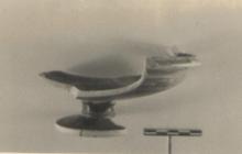 | Description: | About two-thirds of wall and rim missing. Cup foot, torus, with incised line around stem; thickened lip, sloping, and projecting slightly on the outside. Black to mottled red glaze, with traces of stacking; edge of foot, and resting surface, reserved. | |