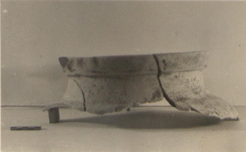 | Description: | Rim and neck, with part of shoulder, preserved. Short, slightly concave neck and thickened rectangular lip. Soft buff clay; dull somewhat peeled black glaze on rim, and for band on shoulder. | |