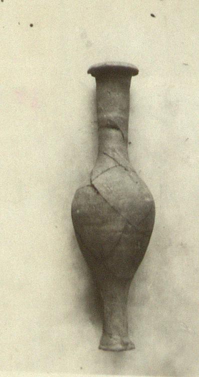 Description:   Much mended; part of the body missing. Fusiform. Around the neck, one white painted band; around the body, two bands, the lower one very faint.