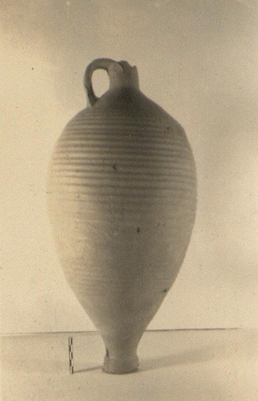 Description:   The mouth broken off; large hole in shoulder. One-handled jug with horizontally grooved body.