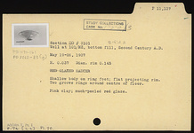 | Description: | Shallow body on ring foot; flat projecting rim. Two groove rings around center of floor. Pink clay; red glaze, much peeled. | |