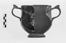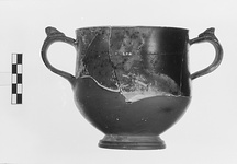 | Description: | The bottom is missing, one handle, and part of the wall. Restored in plaster. Similar in shape and decoration to P 11235 (ΠΘ 3217) but larger; no incised groove around the body. Woman's head thumb-rests on handles. On either side necklace with pendents in terracotta paint; interlaced drops, and small sprays and ribbons. Painted inscription above necklace on one side: Φ Ι [Λ Ι Α] Σ Glaze black to red. ADDENDA P 11235: Convex lower body; upper wall slightly concave; plain rim. Moulded ring foot with an incised groove; another at junction of upper and lower body, and around foot. Ivy leaf thumb-rests on the band handles. | |