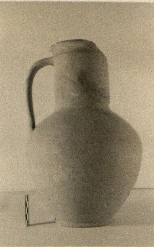 | Description: | Part of neck and lip missing. Low flat projecting base and plump ovoid body; straight neck with slightly flaring lip and a raised ring below at the attachment of the band handle. Pinkish-buff clay. Traces of creamy slip; unglazed. | |