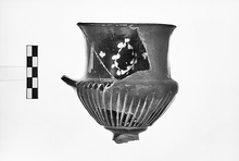 | Description: | The foot and the vertical band handles missing, together with much of the body and rim. The lower body ribbed; on the upper body, a hanging wreath, with a ribbon hanging at each side, in terracotta paint. Good black glaze. | |