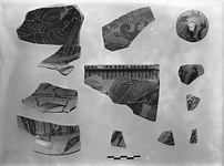 | Description: | Lower edge of fragment, part of an outer figured zone, preserved. Upper edge, tips of rays. Underside covered with thin glaze save upper edge (toward center) where part of a reserved circle is preserved; parts of two double concentric bands of applied purple on the black. Depiction of two confronted sirens and a leopard. On figures, free use of rather careful incision, and of purple (laid on the black); faces of sirens and neck of leopard white laid on red. ADDENDA "Near the KX painter" (JDB letter 25. Jan 1953). | |