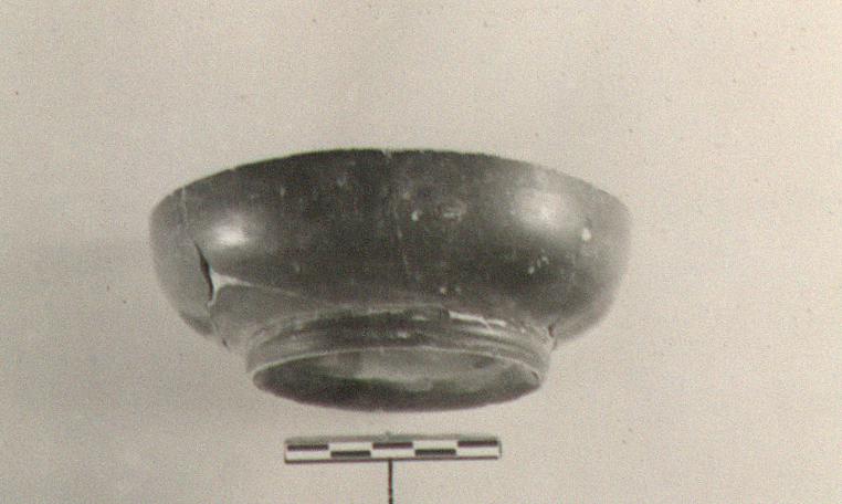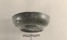 Description:   About one-third of rim and wall missing. Medium high foot ring; rim flattened on top, setting it off sharply from walls. Inside, a series of incised circles are surrounded by five stamped palmettes, these in turn by a band of ovules impressed between two incised circles.
