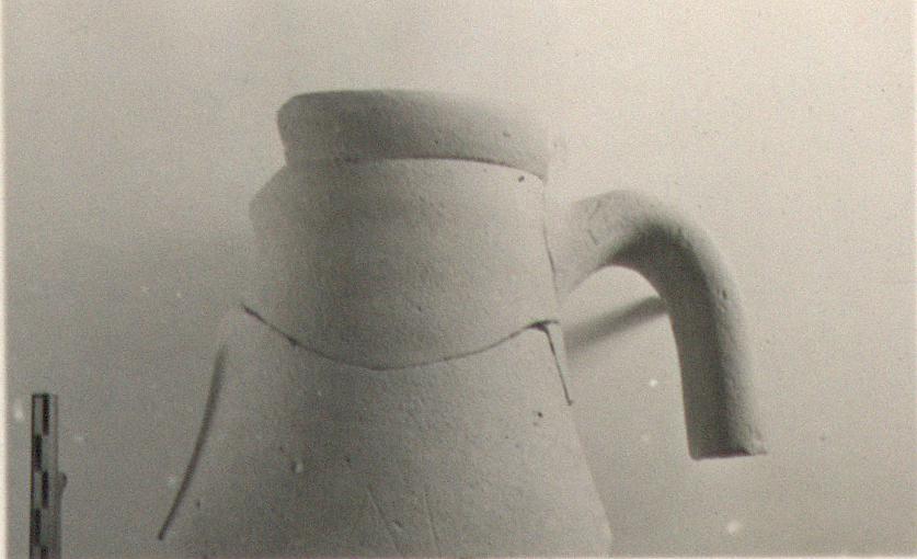 | Description: | Part of rim and one handle, most of neck preserved; rounded flaring lip. At either side, just above shoulder: <graphic> Fairly fine clay, dark, dull, almost greenish-buff, tending to be streaky at surface. | |