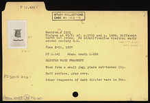 | Description: | Neck from a small jug; plain out-turned lip. Buff surface, gray core. Other fragments of dark blister ware in box. | |
