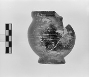 | Description: | About half the wall and more than half the rim, with the vertical band handle, missing. Round-bodied jug or mug on high ring foot; vertical lip; no neck. Possibly a kantharos. Glaze red to black. | |