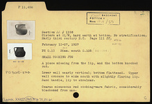| Description: | A piece missing from the lip, and the bottom knocked out. Lower wall nearly vertical; bottom flattened. Upper wall concave to wide mouth with slightly flaring lip. Band handle, lip to shoulder. Coarse micaceous red cooking ware fabric, considerably blackened from use. | |