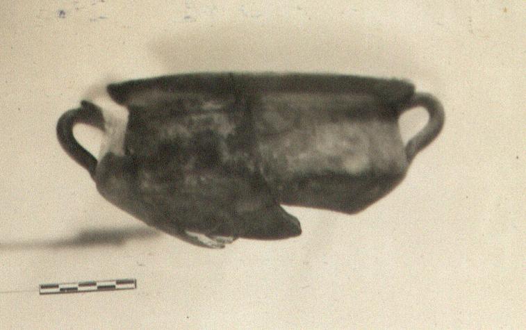 | Description: | Center of bottom missing, and about one-quarter of rim and walls. Restored in plaster. Angular body, flaring rim, small vertical handles; two grooves below rim outside. Red paint inside only; outside blackened from use. | |