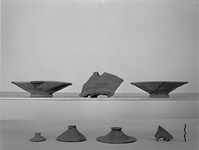| Description: | The bottom and about one-third of the wall and rim preserved. An unglazed saucer with flaring sides and flat rim; ring foot. Pinkish-buff clay; traces of white inside(?). | |