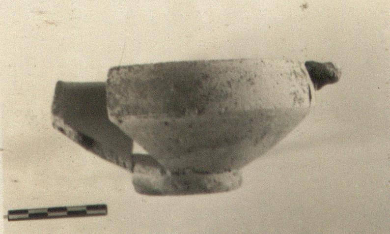Description:   One handle and fragments of rim and wall missing. Restored in plaster. Angular sides; ring foot. Horizontal handle attached near rim and sharply bent back against wall.