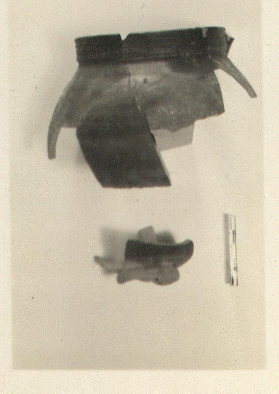 Description:   Part of the upper body preserved with most of the rim. Handle missing. Fragment from bottom, with ring foot, does not join. Both pieces filled out with plaster. Round-bodied jug on small ring foot. Wide round neck-mouth, grooved on the outside. Grooved band handle.