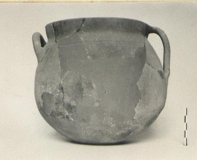 | Description: | About half preserved with one vertical band handle, lip to shoulder, and one horizontal rolled handle on the shoulder. Round bodied pot, the walls narrowing slightly to vertical rim. Groove around wall at line of attachment of horizontal handle. Micaceous red clay, slightly blackened. Cf. Agora XXXIII, no. 606. | |