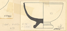 | Description: | Chip missing from lip; restored in plaster. Plain deep Pergamene bowl on high moulded foot. Groove around lip outside. Poor red glaze over all. | |