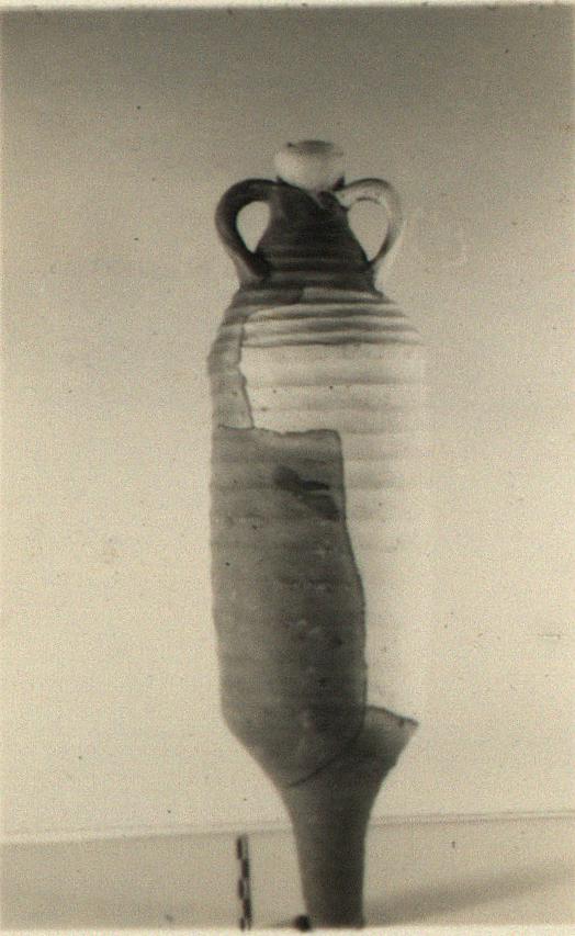 | Description: | More than half of cylindrical body missing, but profile complete save mouth. Small ridged handles from below lip to shoulder. Broad ribs on body; narrower on toe. Graffito on neck: <graphic> Red micaceous clay. Very coarsely made. | |