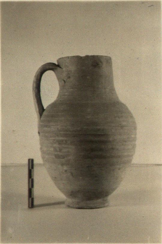 | Description: | Part of mouth missing; otherwise intact. The shape much as P 11576 (Φ 513), but the mouth slightly flaring. Ribbing on body. Buff clay. Thin dull light brown glaze, except toward foot. | |