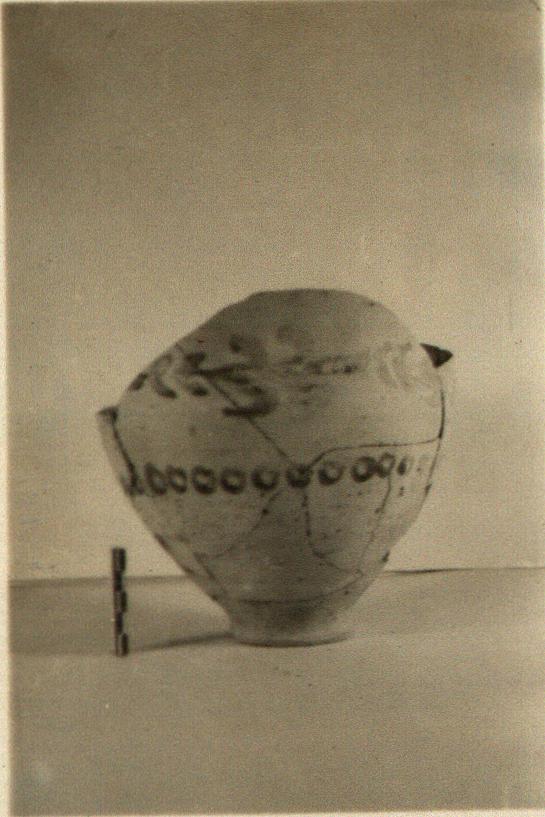 | Description: | Base and lower part of body of a closed pot on ring foot (decanter? oinochoe?). Around body, a sort of leaf pattern in brownish glaze with added white. Below this, a row of small brown circles with white centers. Pale buff clay and slip. Tubular decanter mouth which might belong, in tray. Containers 77 and 86. | |