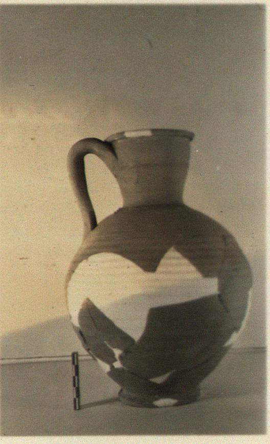 | Description: | Fragments of body missing; restored in plaster. Ring foot; plump round body; neck larger above than below, and slightly bulging; flat projecting lip; band handle with shallow groove, from neck, rising above lip, to shoulder. Grooves at top of shoulder and around neck; body ribbed. Clay pinkish-buff. Slip yellowish-buff. | |