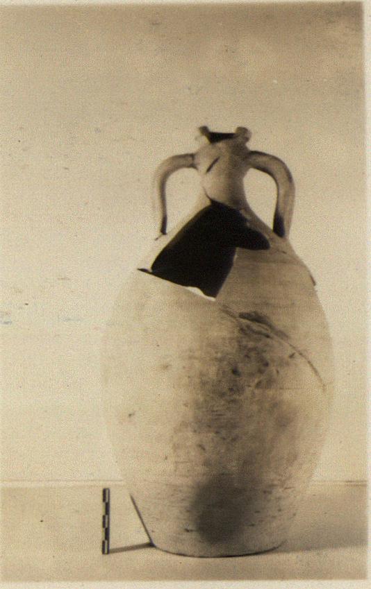Description:   Fragment of lip and some of body missing. Flat, inset bottom, with no base ring visible on exterior; pear-shaped body; narrow neck; ridged band handles.