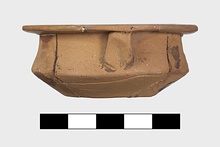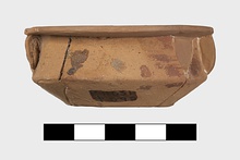 | Description: | Fragments of body and lip missing. Rather rough, flat bottom; flat out-turned rim; two rough vertical handles (one missing). Yellow-buff clay. Remains of dull red glaze. | |