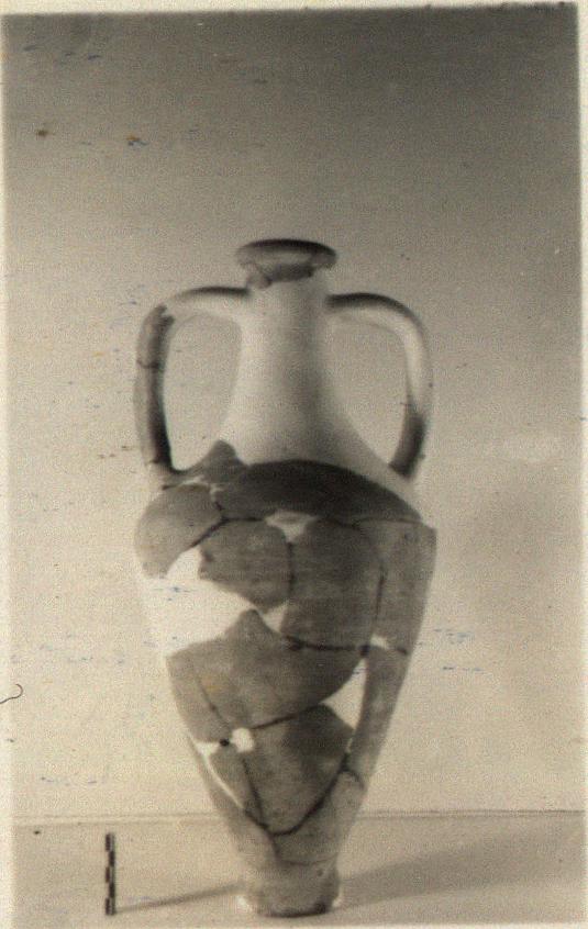 | Description: | Neck, one handle, much of shoulder and fragments of body missing. Restored in plaster. A non-joining fragment of mouth probably belongs. The body tapers down to a rather small heavy foot; narrow mouth; high handles. Clay brownish. Traces of white paint on surface. | |