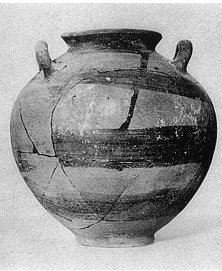 | Description: | A few fragments of body missing. Low ring foot; round body; low out-turned mouth; two horizontal handles on shoulder. Red clay, grayish at surface; slightly warped and misfired. Outside of mouth, dull black glaze, and three irregular black stripes around body. | |