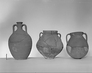 | Description: | Part of one handle and fragments of mouth and body missing. Restored in plaster. Round bottom; body and neck form continuous curve; wide mouth. Clay buff, rather gritty and micaceous. Remains of pale buff slip. | |