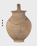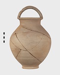 Description:   A few fragments of body missing. Low neck; rolled lip, projecting; ridged basket handle.