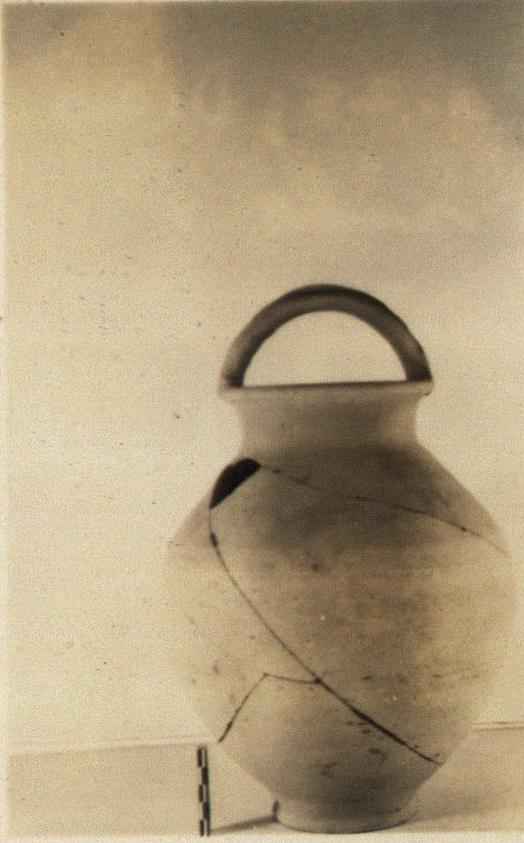 Description:   A few fragments of body missing. Low neck; rolled lip, projecting; ridged basket handle.