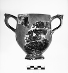 Description:   One handle and much of rim and wall restored in plaster. Elongated shape on moulded ring foot; upper wall nearly vertical. Deep grooves about waist and rim; handle spurred, with mask. Traces of incised wave pattern with white detail on rim.