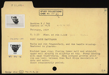 | Description: | Walls and rim fragmentary, one handle missing. Restored in plaster. Moulded base ring; flaring lower wall and straight upper wall sloping in slightly at top; strap handles with mask thumb-rests. Deep scraped grooves about rim and body; between them, West Slope decoration of dots and waves. Glaze considerably peeled. | |