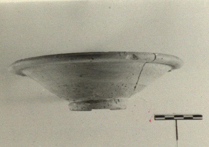 | Description: | Fragment of side missing. Shallow flaring bowl on base ring. Single broad groove on projecting rim. Thick reddish-buff clay. Unglazed. | |