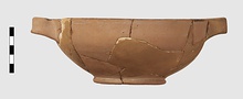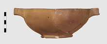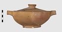 | Description: | One handle and much of wall both of lid and bowl missing; restored in plaster. Low false base ring; deep bowl with inside ledge for lid. Horizontal strap handles. Slightly domed lid with heavy hollow knob. Bowl black glazed on inside; the lid black glazed on most of its top. | |