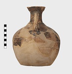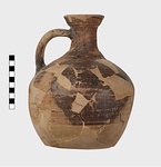 | Description: | Lower part missing; partially restored in plaster. Ovoid body; tall cylindrical neck with flaring collared rim; neck to shoulder handle, round in section. Thin brown glaze on upper part only; pinkish clay, pale buff surface. | |