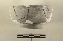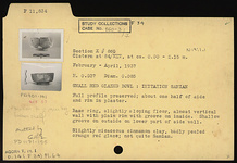 | Description: | Full profile preserved; about one half of side and rim in plaster. Base ring; slightly sloping floor; almost vertical wall with plain rim, grooved on inside. Shallow groove on outside, on lower part of side wall. Slightly micaceous cinnamon clay. Badly peeled orange-red glaze. Not quite Samian. ADDENDA Broken fragment in paper bag, on bottom shelf. | |