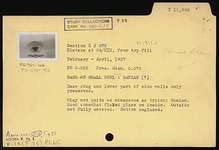 | Description: | Bowl: Samian? Base ring and lower part of side walls only preserved. Clay not quite so micaceous as typical Samian. Good somewhat flaked glaze on inside. Outside not fully covered. Bottom unglazed. | |