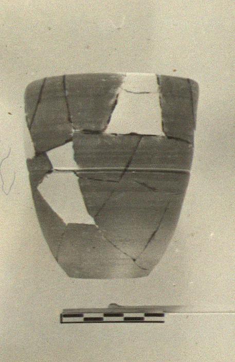 | Description: | Full profile preserved; missing fragments restored in plaster. Shape and fabric similar to P 11855 (Χ 881), but somewhat more slender. Groove around middle of wall. Fired red-brown all over. Possibly had thin glaze wash. | |
