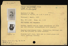Description:   Bottom, handle and at least two-thirds of side and rim missing; strengthened with plaster. Angular pear-shaped body; projecting vertical rim with two grooves on outer surface.
