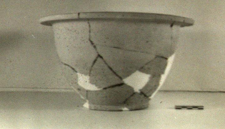 Base ring; steep slightly rounded sides; horizontal rim with three grooves.