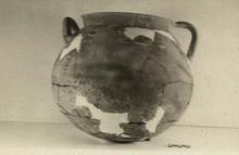 Rounded bottom; slightly flaring rim with thickened lip; one horizontal and one vertical handle.