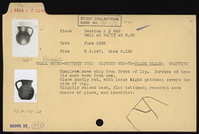 Description:   Complete save chip from front of lip. Surface of handle much worn from use. Round mouth; slightly raised base, flat bottomed; reserved save smears of glaze.