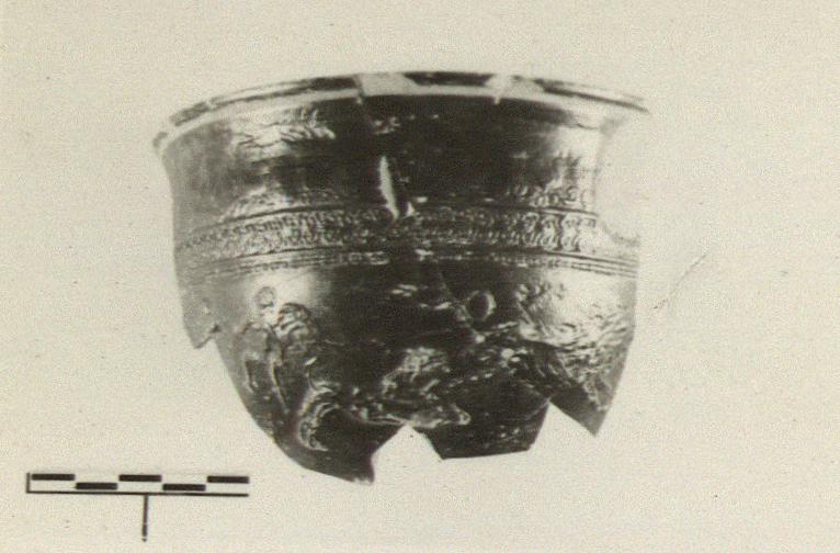 | Description: | About one-third of rim and side wall down to tip of leaf of bottom medallion preserved. Slightly out-turned rim with deep groove scratched through clay just below. Restored in plaster. Relief decoration: on side wall, starting at left, head of a deer and Eros to left; dog pursuing a lion to right; elaborate upper border. Good metallic glaze, somewhat chipped. | |